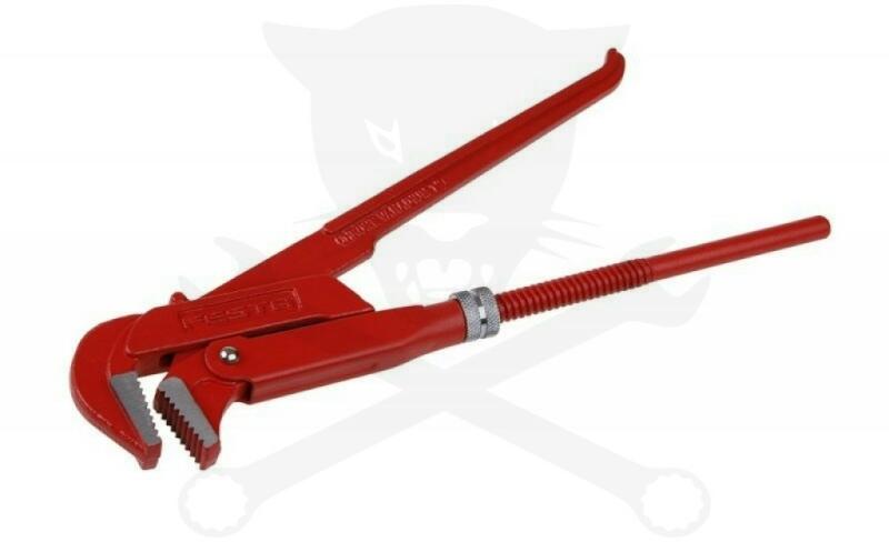 Csőfogó 90° Jellemzők: Pirosra porlakkozott, pofák simára köszörülve · Kettős T-profilú fogantyú · Kovácsolvas · Elveszíthetetlen állítóanya · A forgásiránnyal szemben elhelyezkedő fogazás · 90°-ban lesarkított pofa · Svéd alak · A fogazás külön induktív úton edzett · Króm-vanádium-elektroacél, kovácsolt és olajban edzett Műszaki adatok: ATT. LOV. PIPE_DI