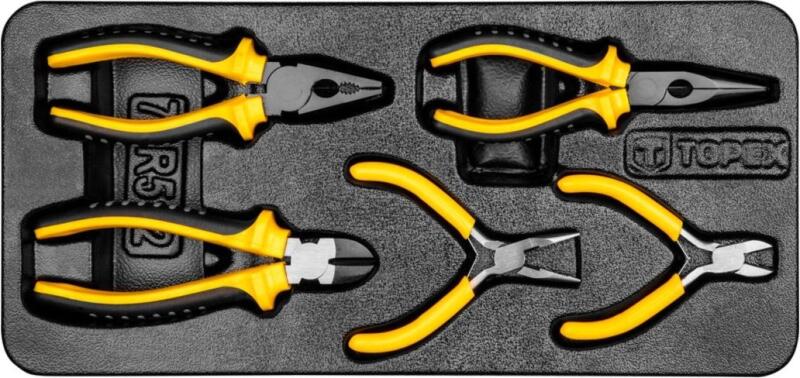 Topex Fogók, 5 db-os készlet (ref. sz. 79R512) A TOPEX fogókészlet 6 darab, a leginkább univerzális fogóból áll. A fogók edzett acélból készülnek, a vágó felületek indukciós eljárással edzve. Az ergonómiailag tervezett, csúszásgátlóval ellátott markolatok növelik a munkavégzés biztonságát és komfortját. A termék kiválóan illeszkedik a tenyérhez. A TOPEX márka