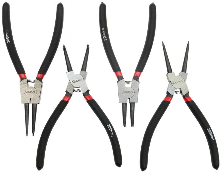 A termék leírása: Rögzítőgyűrű-fogó biztosítógyűrűk össze- és szétszereléséhez. Egy fogókészlet lehetővé teszi a belső (a hüvely belsejében bővülő) és a külső (a tengelyen kívüli rögzítés) biztosítógyűrűk össze- és szétszerelését. A készlet 4 féle fogót tartalmaz. Kiváló minőségű CrV króm-vanádium acélból készült , a fogók nyele csúszás