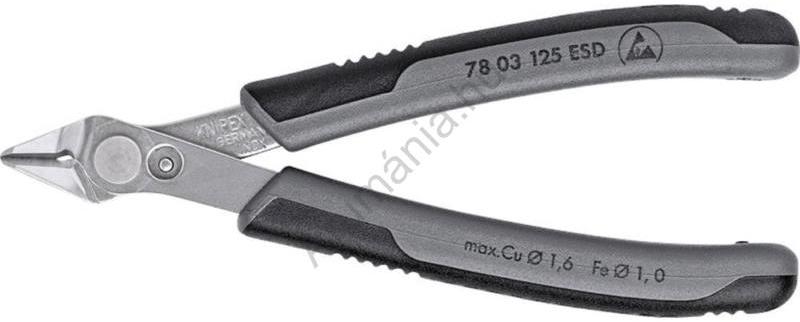 Electronic Super Knips ESD Precíziós fogók a legfinomabb vágómunkákhoz, például az elektronikában és finommechanikában. Kivitel villamosan levezető - disszipációs. Köszörült, nagyon éles, fazetta nélküli vágóélek. Nyírás ellenőrzött mikro-vágóél eltolással a legvékonyabb huzalok lehető legpontosabb vágása és a hosszú élettartam érdekében. A precíz formájú