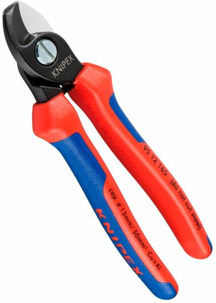 Kábelolló, Knipex 95 12 165 Max. 50 mm2 Tisztán és simán, zúzás nélkül vág. Könnyű vágás egykezes működtetésnél. Befogásvédelemmel, utánállítható csavaros csukló, önbiztosító. Precíziósan köszörült, keményített élek. Különleges minőségű speciális szerszámacél, kovácsolt, olajban edzett Barnított szerszám. Jellemzők: Markolat többkomponensű bevonatt