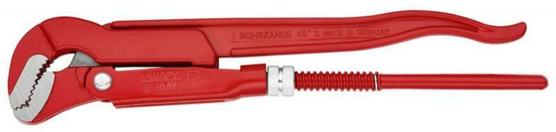 S-pofájú csőfogó Jellemzők: kettős-T alakú fogantyú · pirosra porlakkozva, pofák simára köszörülve · kovácsolt · elveszíthetelen állítóanya · a fogazás kiegészítő indukciós edzése · keskeny S-alakú pofák · a forgásiránnyal ellenétes irányú fogazás · 3 pontos fogás a csövön, önszorító · króm-vanádium elektroacél, kovácsolt, olajban edzett Műszaki a