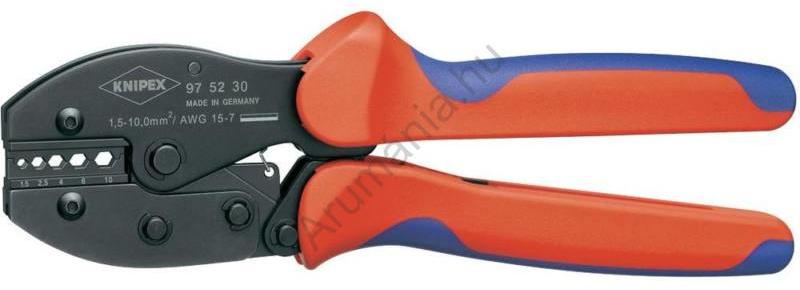Emelőkaros krimpelő fogó, KNIPEX 97 52 Egykezes kezelés Jellemzők: Precíziós és oldható kényszerreteszelésű profilokkal, szabványnak megfelelő forrasztásmentes, tartósan magas krimpelési minőséggel, elektromos csatlakozásokhoz · A krimpelési nyomás gyárilag precízen be van állítva (kalibrálva) · Az emelőkar áttétellel nagy erősokszorozás jön létre a fáradságme
