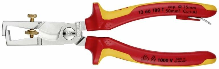13 66 180 T BK KNIPEX StriX Vezetékcsupaszító kábelvágó ollóval – két alapvető fontosságú szerszám az elektromos szereléshez egyetlen fogóban. Integrált kábelvágó olló réz és alumínium kábelek tiszta, törés nélküli vágásához. Kiegészítőleg induktívan edzett vágóélek, vágóél-keménység kb. 57 HRC A csupaszító pengék univerzális beállítása recézett