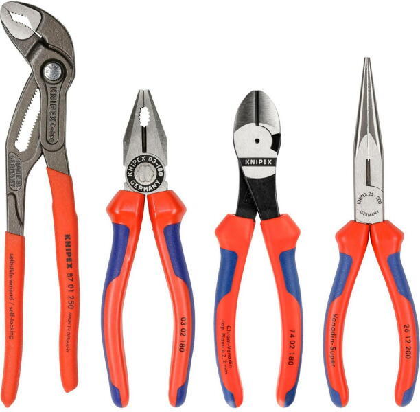 4 db-os Knipex fogó készlet, Knipex Cobra vízpumpa fogóval Négy fogó habanyag betéthez munkapadhoz és műhelykocsihoz, az átlátható tárolás érdekében. Jellemzők: Pontos vályúk a fogók rögzítéséhez · Habanyag betét mérete (Sz x Ma x Mé): 335 x 33 x 165 mm · Nyersanyag: kétszínű, zártpórusú habanyag. Műszaki adatok: Gyártói szám: 00 20 01 V15 · Méret, hossz: 1
