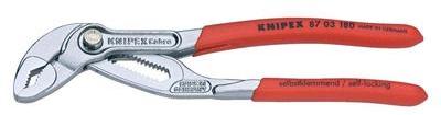 KNIPEX Cobra® Hightech-vízpumpafogó A finombeállítás nyomógombbal A finombeállítás egy kézzel közvetlenül a munkadarabon elvégezhető. Jellemzők: önszorító a csöveken és anyákon: nem csúszik le a munkadarabról, erőtakarékos munkavégzés · a becsípődés elleni védelem megakadályozza a zúzódási sérüléseket · egykezes állítás · fogófelületek speciális edz
