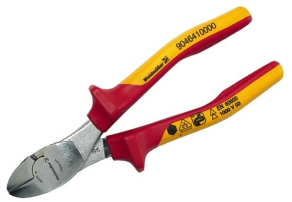 WEIDMÜLLER SE TOP VDE szerint szigetelt oldalvágó fogó (csípőfogó), 145 mm (9046340000) Term ékinformáció: Amikor feszültség alatt álló elemeken dolgozik, speciális irányelveket kell betartania és speciális, kifejezetten erre a célra gyártott és bevizsgált szerszámokat kell használnia. A Weidmüller teljes választékot kínál olyan fogókból, amely megfelelnek az ország