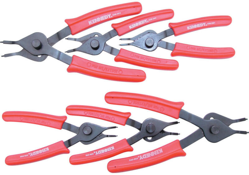 Külső és belső Seeger-biztosítógyűrűk ki és beszereléséhez használható, megfordítható egyenes és hajlított pofák. Válogatott, minőségi szánacélból gyártva, kényelmes fogást biztosító műanyag bevonatú markolat. Seeger gyűrű fogókészlet, 6 darabos, egyenes és hajlított megfordítható pofák. Műanyag tárolódobozban. Összetétel: 1 - 1 darab a fent felsorolt t
