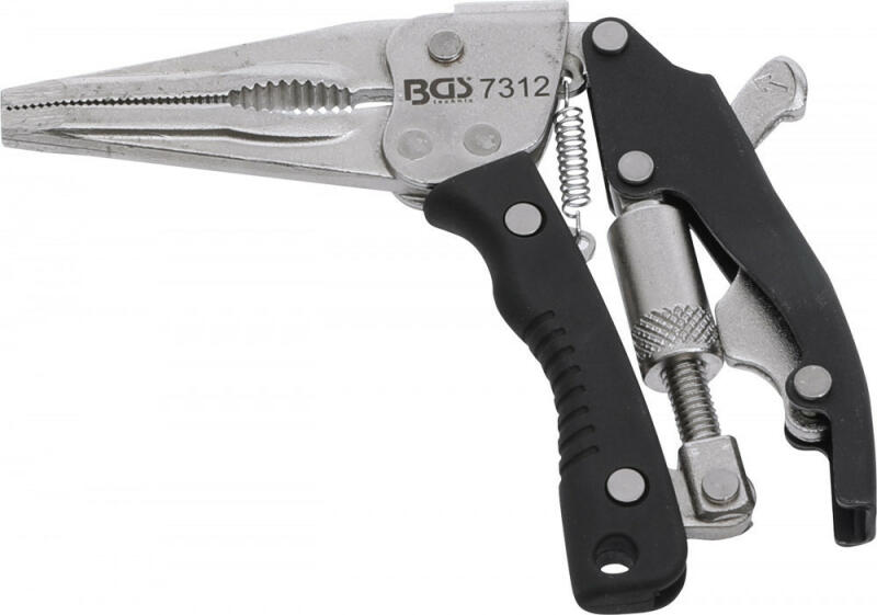 Jellemzők: biztonságos tartáshoz és megfogáshoz különösen szűk és nehezen hozzáférhető helyeken ergonomikus pisztolymarkolattal és egykezes kioldókarral különleges fejalak hosszú és karcsú állkapcsok, 70°-os szögben fogazott fogópofák, edzett és temperált Befogási szélesség min. : 0 mm Befogási szélesség max. : 40 mm Műszaki adatok: Anyag: Króm-molibdén acél Fe