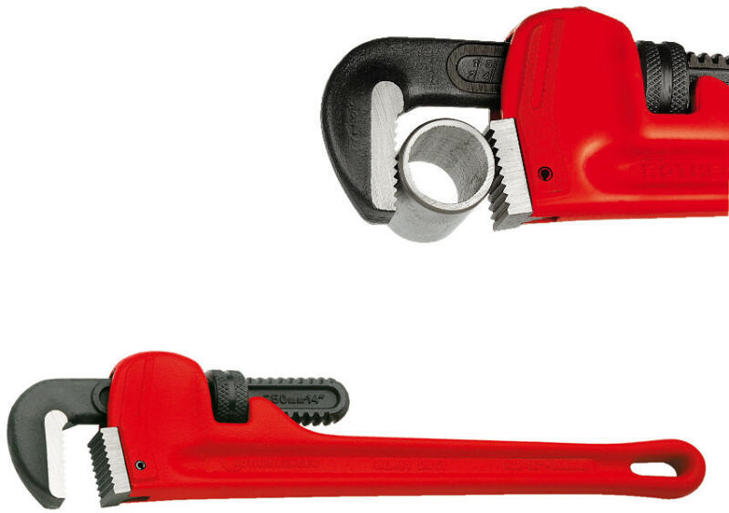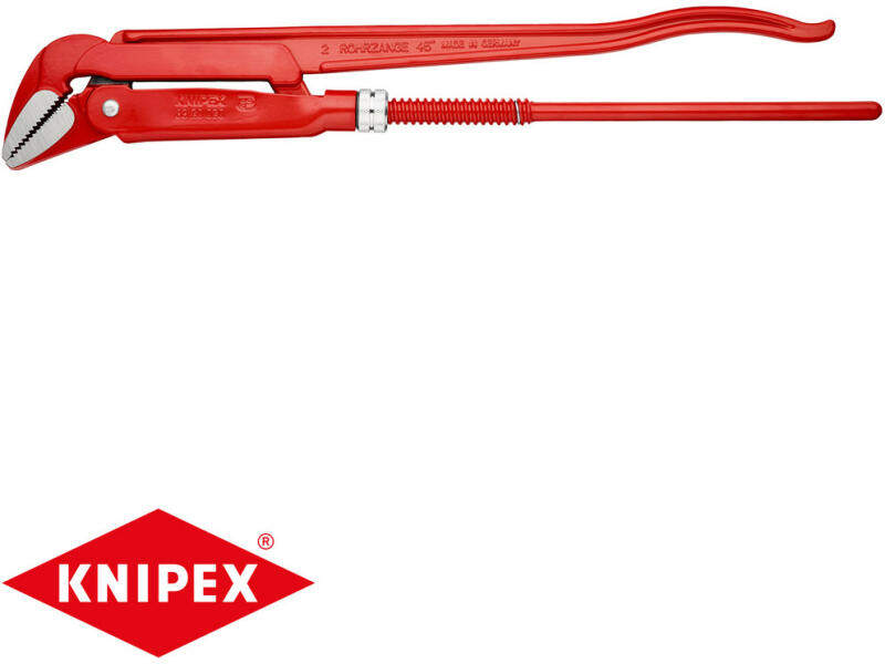 csőfogó 45° Jellemzők: pirosra porlakkozva, pofák simára köszörülve · elveszíthetelen állítóanya · kettős-T alakú fogantyú · a fogazás kiegészítő indukciós edzése · a forgásiránnyal ellenétes irányú fogazás · svéd alak · kovácsolt · 45°-os szöben megtört pofa ·króm-vanádium elektroacél, kovácsolt, olajban edzett Műszaki adatok: ATT. LOV. PIPE_DIAMETER_