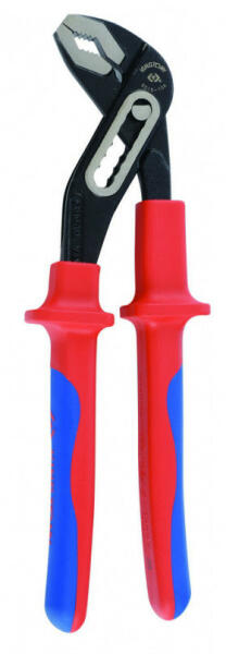 King Tony szigetelt vízpumpafogó adatai Hossz L: 250 mm Befogási méret max. : 36 mm Súly: 420 g A papagájfogó pofája 7 helyzetbe nyitható TP + TPR bevonatú nyéllel 1000V-os szigeteléssel. 1000V VDE, GS, DIN EN 60900 Duál piros/kék TPR nyél, Króm-Vanádium acélból Felületkezelés: foszfátozott Robusztus, erős kialakítás
