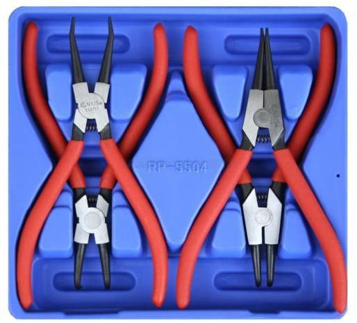 4 db-os készlet 19-60 mm átmérőjű seegerekhez. Anyaguk: Chrome Vanadium acél Tartalma: 1 db fogó külső gyűrűkhöz, egyenes kivitel, 175 mm (7") (cikkszám: 550750) 1 db fogó belső gyűrűkhöz, egyenes kivitel, 175 mm (7") (cikkszám: 550751) 1 db 90°-ban hajlított fogó külső gyűrűkhöz, 175 mm (7") (cikkszám: 550752) 1 db 90°-ban hajlított fogó belső gyűrűkhöz, 175 mm
