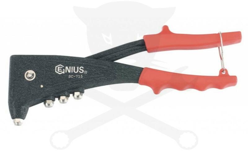 Genius Tools - Canada Egykaros popszegecs behúzó extra erős kivitel, 90° fejjel. Rozsdamentes acél szegecsekhez is alkalmas. A készlet tartalma: 1 db popszegecs-húzó 4 db cserélhető fej; méret: 2.4, 3.2, 4, 4.8mm 40 db popszegecs; méret: 5 db 2.4 mm, 15 db 3.2 mm, 15 db 4.0 mm, 5 db 4.8 mm A Genius Tools fogók és szorítók a legjobb minőségű alapanyagokból, és a legmodernebb te