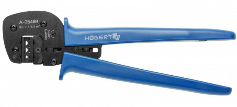HT1P199 Krimpelő fogó, racsnis MC4 csatlakozóhoz, 2,5 / 4 / 6 mm2, 270 mm, HÖGERT HT1P199 Fogó kategória Termékleírás MC4 csatlakozó krimpelő fogó, amelyet a fotovoltaikus panelek összeszerelésénél használnak. Jellemzők kiváló minőségű rozsdamentes acélból készült 2,5, 4,0 és 6,0 mm2 keresztmetszetű MC4 csatlakozók krimpeléséhez precíz racsnis mechanizmus a csúcso