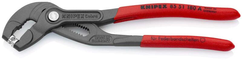 rugós bilincs fogó (180 mm) 1K markolat, cserélhető megfogóbetét QuickSet állítás: beállítás közvetlenül a munkadarabra tolással Használható szabványos, helytakarékos és huzalbilincsekhez, valamint rugószalagos gyűrűkhöz, 50 mm-es névleges méretig Több mint 30 mm-es szorítási út Forgatható, univerzális megfogó betétek a bilincsek biztos megfogásához, minden hely