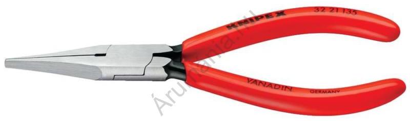 Jusztírozó fogó 135 mm lapos széles pofa Knipex 32 21 135 Jusztírozófogó króm-vanádium-elektroacél kovácsolt olajban edzett nyelek műanyaggal bevonva 2. alak: lapos széles pofák Jellemzõk: polírozott fogófelületek az élek gondosan sorjamentesítettek kis átmérõjű alkatrészek és huzalok megfogására továbbá érintkezõ- és jelfogórugók meghajlítására Műszaki adato