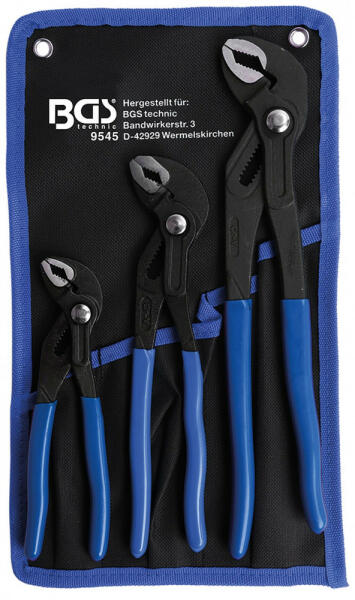 Jellemzők: bilincsvédővel kovácsolt és edzett feketére festett pofák és szár fényesre polírozott merítéssel szigetelt fogantyúk gördülős szerszámtáskával A nyílásméret reteszelve van, és nyomógombbal feloldható a beállításhoz vízpumpafogó, reteszelhető, 175 mm, nyílásméret max. 32 mm (BGS 9541) vízpumpafogó, reteszelhető, 240 mm, nyílásméret max. 36 mm (BGS