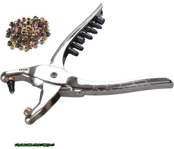 Revolver-lyukasztófogó CrV. (króm-vanádium acél) Fém markolat Krómozott Szegecskarima (különböző színű) Az Extol Craft revolver-lyukasztófogó lyukak stancolására alkalmas kartonon, bőrön, textilen és műanyagon. 6-féle lyukasztóval, amelyek könnyen cserélgethetők (Ø 2.5mm, 3mm, 3.5mm, 4mm, 4.5mm, 5mm). 100 db szegecskarimával, amelyek 4 különféle színben jár a fogó