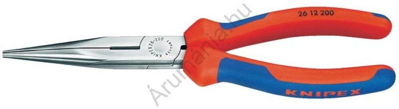 Fél-kerek csõrű fogó vágóéllel (gólyacsõr fogó) 200 mm 201 g Knipex 26 12 200 Lapos-kerek fogó vágóélekkel A Knipex gólyacsõr fogónak polírozott a feje és a szárainak többkomponensű bevonata van. Jellemzõk: Elcsavarodást tűrõ elasztikus precíziós hegyekkel Lapos-kerek hosszú hegyesen kifutó pofák Vágóélei (keménység kb. 61 HRC) lágy félkemény és kemény huza