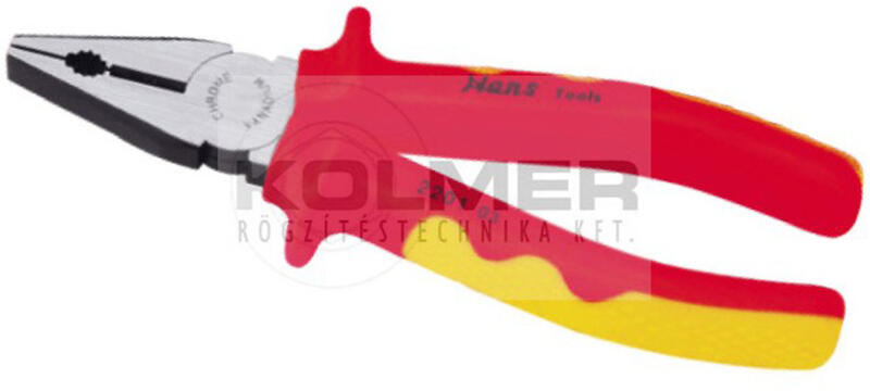HANS szigetelt kombinált, egyetemes fogó 200mm 1828-8 VDE 1000V az iSzerszámnál. Professzionális, ipari minőségű (Industrial) szigetelt HANS kombinált, egyetemes fogó. Méret: 200 mm. Vágási kapacitás: réz/alu: 220-250 N/mm2: 4 mm, vasszeg 750-800 N/mm2: 3 mm, sodrott huzal/acélszeg 1600-1800 N/mm2: 2 mm, edzett acélhuzal 2200-2300 N/mm2: 1,6 mm. Anyaga Króm-vanádium. Ergonomikus
