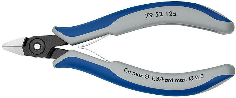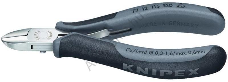 ESD elektronikai oldalcsípõfogó lágy/közepes/kemény huzal max. : ? 1 6/1 2/0 6 mm Knipex 77 12 115 ESD Elektronikai ESD-oldalcsípõfogófogó Különleges minõségű speciális szerszámacél kovácsolva olajban edzve tükörpolírozott fej a nyelek többkomponensű bevonattal kerek fej fazettával és huzalszorítóval - így nem szóródhatnak szét a levágott huzalvégek Jellemzõk: Á