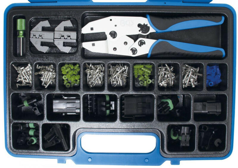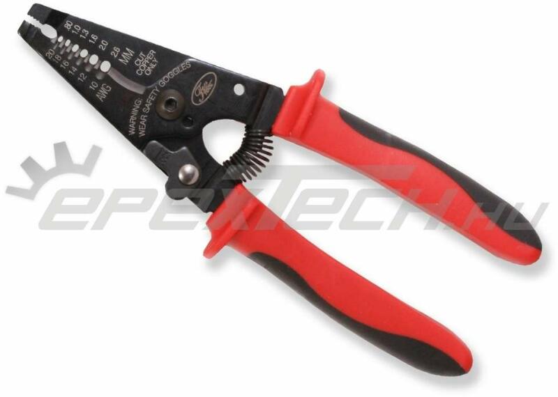 Angol nyelvű leírás (a magyar fordítást lásd lejjebb):for repairing of the existing cablingand for new wiringincludes the following tools:quick change ratchet crimper (aluminium made)jaw pair (H6) for wire sizes: DIN 0.35 / 0.5 - 0.8 mm2 (AWG 22 / 20-18)jaw pair (H7) for wire sizes: DIN 1.0 - 2.0 / 3.0 mm2 (AWG 16-14 / 12)release tool for terminalsincludes following Delphi® waterproof conne
