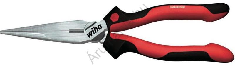 Lapos-kerek fogó, Industrial, vágóélekkel Jellemzők: Szabvány: DIN ISO 5745 · Fejforma: hajlított, kb. 40° · Kivitel: különösen hosszú vágóél lapos és kör keresztmetszetű kábelekhez. A fogófelületek részlegesen fogazottak. Élek kiegészítőleg indukciósan edzve, kb. 62 HRC-re. · Szerkezeti anyag: Jó minőségű nemesített szerszámacél. · Felhasználás: lágy és k
