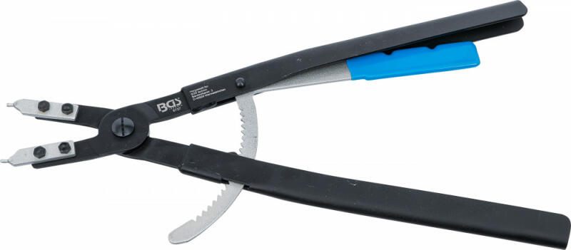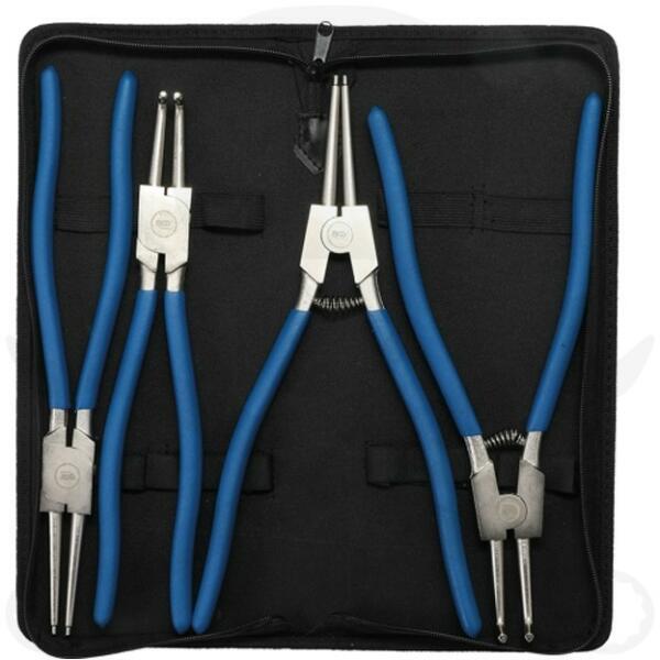 BGS Technic - Germany 4 db-os komplett készlet, szövet, zippzáras tartóban. 2 db 90 fokban hajlított, 2 db egyenes pofájú (1-1 db külső és belső gyűrűkhöz) Méret: 85-200 mm átmérőjű seegerekhez, gumírozott nyéllel.