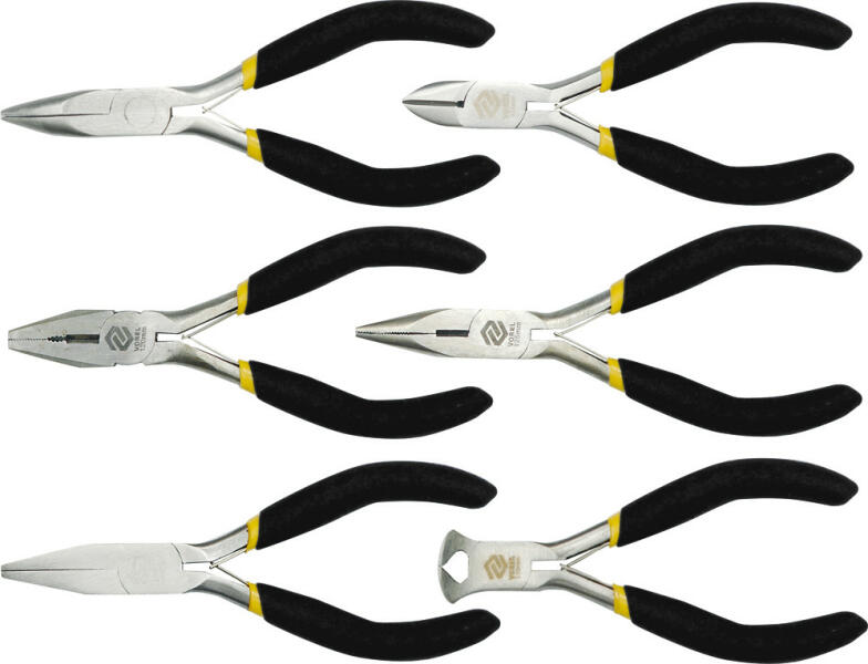 szállítási terjedelem 1db mini kombinált fogó 1db mini oldalcsípő fogó 2db mini kúpos fogó 1db mini hosszú csőrű kúpos fogó1db mini homlokcsípőfogó hossz 125mm anyag króm vanádium acél súly 0.45 EAN 5906083423093
