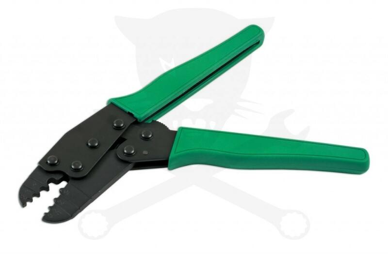 Racsnis krimpelő, saruzó fogó erősített kivielben. Nagy igénybevételű, racsnis krimpelő fogó, amelyet nem szigetelt elektromos csatlakozók krimpelésére terveztek. Használható kisebb méretű akkumulátoros sarukon a földelés csatlakozásához. Szigeteletlen hengersarukhoz -akkumulátor sarukhoz, tesztelés krimpeléséhez. Kényelmes fogórész. Erős krimpelő fej. Racsnis műkö