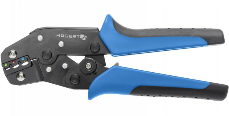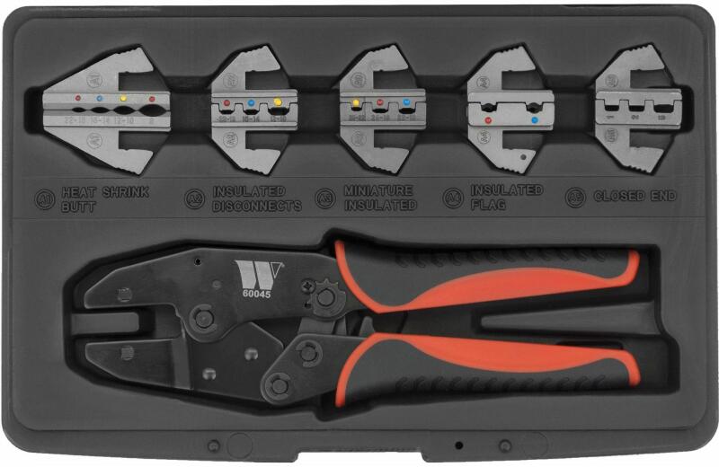 Krimpelő szerszámkészlet racsnis funkcióval és állítható pofákkal. 5 cserélhető krimpelő pofát tartalmaz: hőre zsugorodó tompa csatlakozó szerszám (0.5 - 10 mm 2 ) teljesen szigetelt gyorsleválasztó szerszám (0.5 - 6 mm 2 ) miniatűr szigetelt kivezetéshez (0.1 - 1.5 mm 2 ) szigetelt zászlós kivezetéshez (0.5 - 2.5 mm 2 ) zárt végű csatlakozó és hőre zsugorodó kapocs