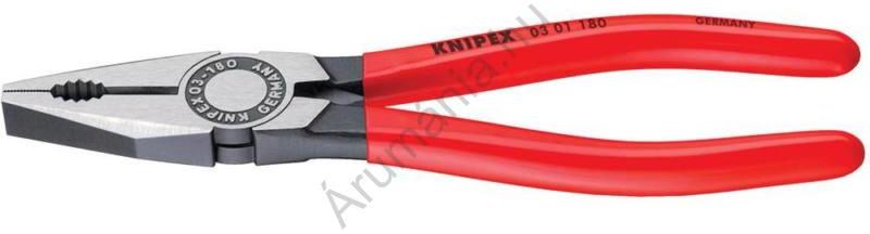 822024 Kombinált fogó, 160 mm, vágási érték: (közepes/kemény) Ø 3,1/2 mm, max. 16 mm2, Knipex 03 01 160 Kombinált fogó Jellemzők fogó zónákkal lapos és körkeresztmetszetű anyagok megfogására és sok más célra lágy és kemény huzalhoz való vágóélekkel hosszú vágóélek vastagabb kábelekhez Élek induktívan edzve, él keménység kb. 60 HRC Műszaki adatok : Vágási