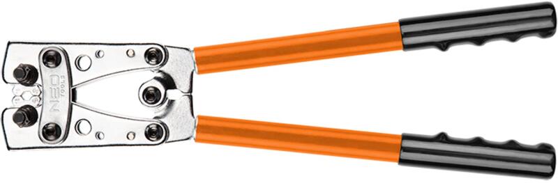 Sajtoló fogó konnektor csatlakozókhoz (ref. szám: 01-530) NEO, hossza 390 mm. A 6-50 mm2 végződésekhez használható. A méretek könnyű cseréje megkönnyíti a munkát. Az ergonomikus fogantyú növeli a komfortot. Tulajdonságok Neo krimpelő, kábelsaru fogó , 01-530, hossza 390 mm A 6-50 mm2-es csatlakozókhoz használható A pofák könnyű cseréje megkönnyíti a munkát Az ergono