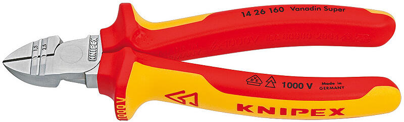 VDE kábelcsupaszoló oldalcsípőfogó, KNIPEX 14 26 160 Villanyszerelésnél nélkülözhetetlen. Jellemzők: Vanádiumacél, nemesített, olaj edzésű · Többkomponensű markolat bevonattal szigetelve · Kábelcsupaszoló lyukak tömör, vagy sodrottvezetőjű vezetékekhez · Indukciós edzésű precízziós él. Műszaki adatok: Alkalmazás (fogók): VDE · Anyag: Vanádium elektroacél ·