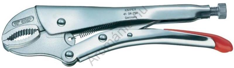 820676 Markoló fogó, 250 mm, szorítási Ø henger 40 mm, 4 szög: 20 mm, 6 szög: 30 mm, Knipex 41 04 250 Szorítófogó Leírás Biztosan tartja a kerek-, profilos- és sík anyagokat is Nagy terhehetőségű Állítócsavarral és kioldókarral Egy kézzel is működtethető Nagy szorítónyomás az emelős áttétellel. Műszaki adatok : Anyag: NikkelezettFesztáv (csipeszpofák): Ø 40 mm,