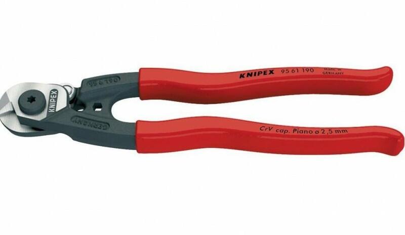 KNIPEX 95 61 190 drótkötélvágó olló, kovácsolva Jellemzők: Kemény drótkötelek, kábelek és köracél számára is alkalmas · Összesajtolási feladatokra is, pl. kerékpár Bowden-huzal véglezáró hüvelyek · Precíz, könnyű járatú csavaros csukló · A csuklóban fekvő nyitórugó, védett és elveszíthetetlen Zárókallantyúval · A különleges élgeometria megakadályozz