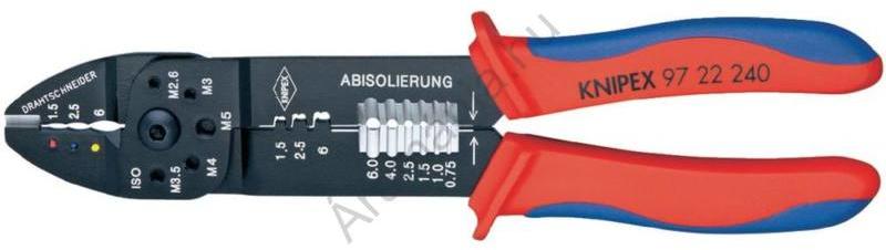 825480 Krimpelő fogó 240 mm, kábelsaruk + dugaszoló csatlakozó, Knipex 97 22 240 Krimpelőfogó szigetelt kábelsaruk/csatlakozódugók, szigetelés nélküli, nyitott csatlakozódugók számára Főbb jellemzők Szigetelt kábelsaruk/csatlakozódugók, szigetelés nélküli, nyitott csatlakozódugók (6,3 mm dugószélességig) szigetelt/szigetelés nélküli: 0,75 - 6/0,5 - 6 mm2 mm2 Leír