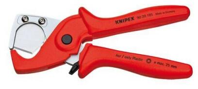Tömlő és védőcső vágó, Knipex 90 20 185 Egyenesen, tisztán vág, deformálódástól mentesen. Jellemzők: Cserélhető kések · Nyitórugóval és reteszelő kilinccsel · A szerszám szívós, üvegszálerősítésű műanyagból készül · Kés, nagyszilárdságú speciális acélból készül, olajban megedzve és megeresztve. Műszaki adatok: Anyag: Szerszámacél · Anyagjellemző
