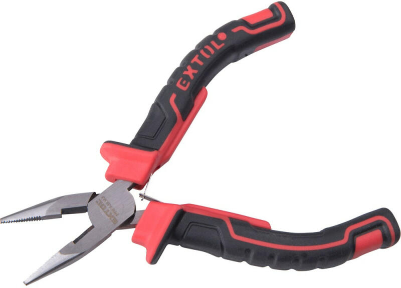 Lapos-kerekhegyű fogók vágóéllel (gólyacsőrű fogó) Króm-vanádium elektroacél, kovácsolt, olajban edzett, polírozott fej, nyelek műanyaggal bevonva Alak :40°-ban megtört pofák Jellemzők: Nagy terhelhetőségű, rugalmas precíziós hegyek · Lapos-kerek, hosszú pofák · Fogazott fogófelületek · Vágóélekkel Ø 3,2 mm méretű félkemény huzalok és Ø 2,2 mm méretű kem