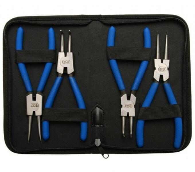 Angol nyelvű leírás (a magyar fordítást lásd lejjebb):straight and bent tipsfor internal and external circlips:non-slip cushion grip handlespliers tip Ø 2.0 mmpacked in a solid vinyl walletincludes the following tools:Pliers for external circlips, angled, 175 mm, opening width max. 30 mmPliers for external circlips, straight, 175 mm, opening width max. 39 mmPliers for internal circlips, ang