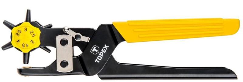 A TOPEX 32D424-es bőrlyukasztó fogó tökéletes választás lehet bőrmunkákhoz és varráshoz. Ez a fogó 240 mm hosszú, és forgófejes kialakítással rendelkezik, hogy könnyebb legyen a lyukak kivágása. A lyukasztási tartomány 2-4.5 mm között van, így rugalmasan alkalmazható különböző méretű lyukak készítésére. A fogó ergonómikus markolata kényelmes fogást biztosít