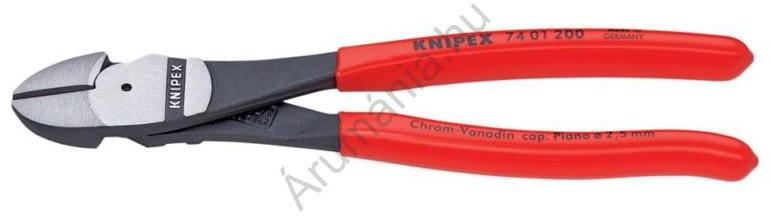 Erő-oldalcsípőfogó nagyteljesítményű króm-vanádiumacél, kovácsolt, olajban edzett, a fogó feketére színezett, a fej polírozott, a nyelek műanyaggal bevonva Jellemzők: nagy vágási teljesítmény kis erővel a vágási szög és az áttételi viszony optimális összehangolása révén · a precíziós élek további indukciós edzésben részesültek, az élkeménység kb. 64 HRC