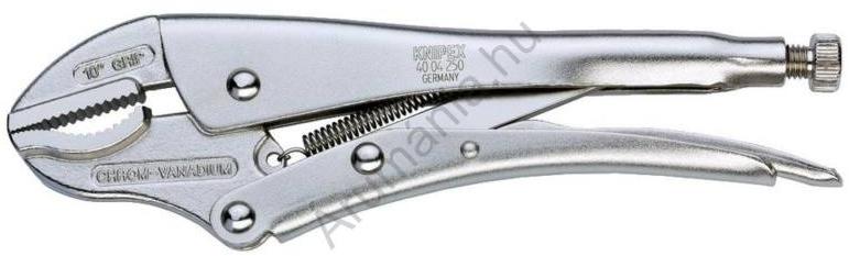822161 Univerzális Grip fogó 250 mm, befogás Ø 35 mm, négyszög 30 mm, hatszög 32 mm, Knipex 40 04 250 EAN Univerzális-markolófogó Jellemzők Állítócsavarral és kioldókarral Félkézzel kezelhető Nagy terhelhetőség Erősen megtartja a körkeresztmetszetű-, a profil- és a laposanyagokat Nagy befogási nyomás a könyökemelős-áttétel révén Műszaki adatok : Méret, hossz: 25