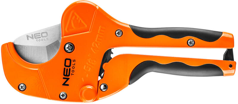 NEO csővágó max. 42 mm átmérőjű műanyag csövek vágására. A vágókés 56-58 HRC. Az ergonómikus bimateriál markolat növeli a használat komfortját. A termék kiváló minőségét és megbízhatóságát bizonyítja a TÜV Rheinland tanúsítvány. A NEO márka a professzionális igényeket is kielégíti. Főbb jellemzők: Neo áttételes PVC vágó Kényelmes, gumírozott markola