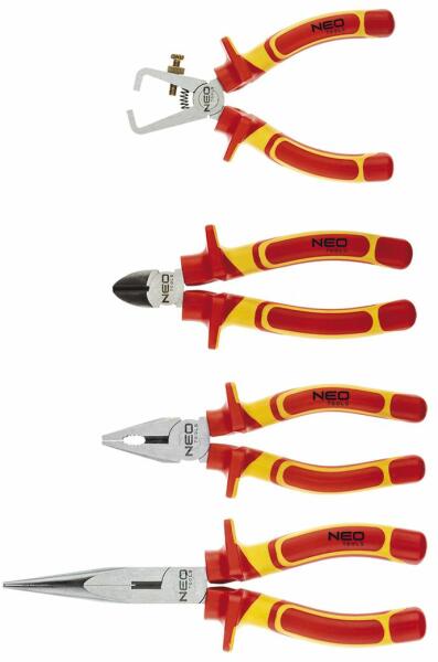 A NEO szerszámkészlet 1000 V 4 elemből áll: csavarhúzókból és fogókból. Max. 1000 V feszültség alatti használatra minősített. A csavarhúzók hegyei kivételesen nagy szilárdságú króm-molibdén acélból készülnek. A fogók pofái króm-vanádium acélból kovácsoltak. Az ergonómikus bimateriál markolat javítja a használati kényelmet. A termék megbízhatóságát bizony