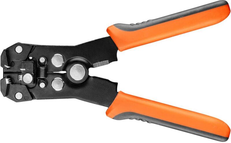 NEO automatikus kábel csupaszító fogó (ref. sz. 01-534) homlokzati kialakítás, mérete 180 mm, kábel csupaszításhoz és a saruk sajtolásához. A csupaszítás tartománya 0.5 - 6 mm2, a sajtolás tartománya 1.5 - 6 mm2. A pofák különösen nagyszilárdságú 52 - 60 HRC keménységű SK5 acélból készülnek, biztosítva a szerszám hosszú élettartamát. A szerszám kábelvágót t
