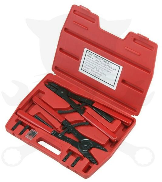 Nagy, masszív univerzális seeger-fogó készlet, erős igénybevételhez. A készlet tartalma: - 1db belső seeger fogó cserélhető fejjel, csúszásmentes piros PVC markolattal - 1db külső seeger fogó cserélhető fejjel, csúszásmentes piros PVC markolattal - 1pár egyenes cserélhető fej belső fogóhoz - 1pár hajlított (45°) cserélhető fej belső fogóhoz - 1pár hajlított (90°