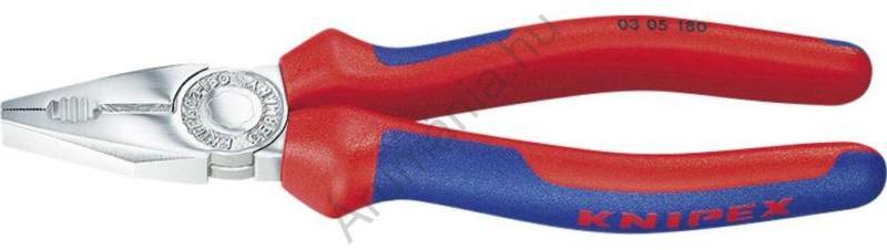 Kombinált fogó, Knipex 03 05 Jellemzők: Fogó igen precíz vágóéllel, lágyabb és kemény huzalok vágásához · A hosszabb vágóél vastagabb kábelek átvágására is alkalmassá teszi, a kopásálló fogó-pofák pedig kemény tartós igénybevételre jók · A fogó pofáinak keménysége kb. 53 HRc anyaga olajban edzett speciális szerszámacél · A vágóélek külön indukciósan