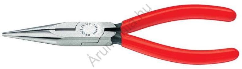 Lapos-kerekhegyű fogók vágóéllel (rádiófogó) vanádium-elektroacél, kovácsolt, olajban edzve, polírozott fejjel, a nyelek műanyagbevonattal 0 alak: egyenes pofák Jellemzők: fogazott fogófelületek · félkemény és kemény huzalok vágásához · hegyes, lapos-kerek pofák · alkalmas a finommechanikában megfogási és vágási munkákra · élek induktívan edzve, élkeménység