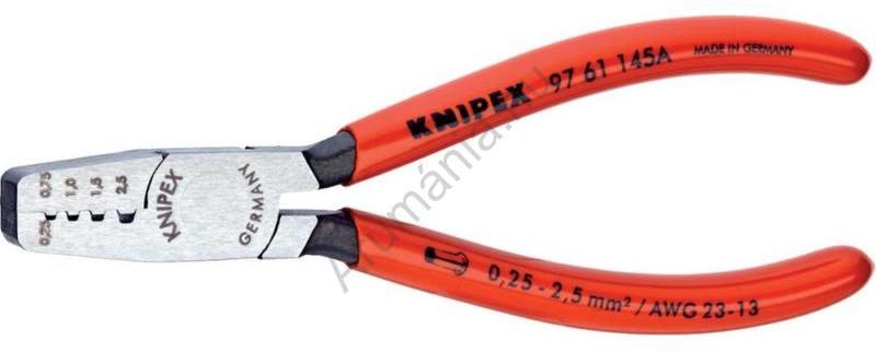 Krimpelőfogó érvéghüvelyekhez Vanádium-elektroacél, kovácsolt, olajban edzett, polírozott fej Jellemzők: Érvéghüvelyek rápréselésére, DIN 46228 Teil 1 + 4, a 0,25 - 2,5 mm2 tartományban · Préselés jelölt trapézprofilokba a hüvely és a vezeték biztos összekötéséhez Műszaki adatok: Anyag: Vanádium elektroacél · Anyagjellemző: Polírozott, Edzett · Gyártói szám: